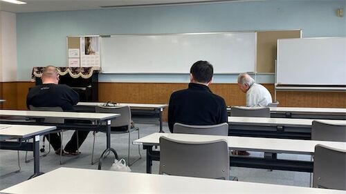 今日の礼拝会場です。 礼拝会場準備終わり、蔵元牧師の導きでお祈りです。 シオン